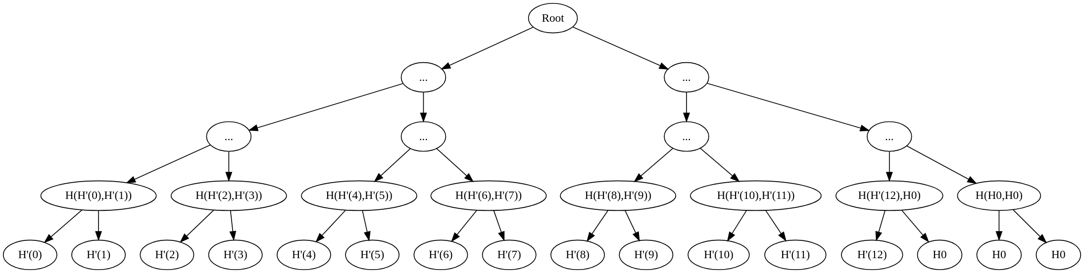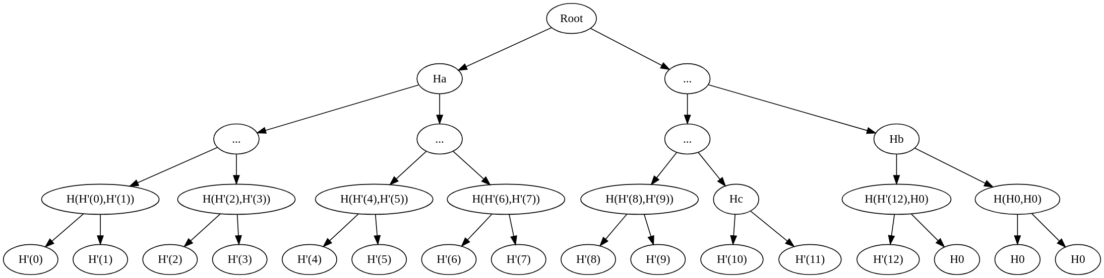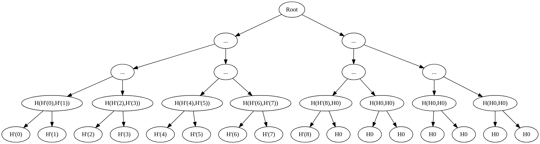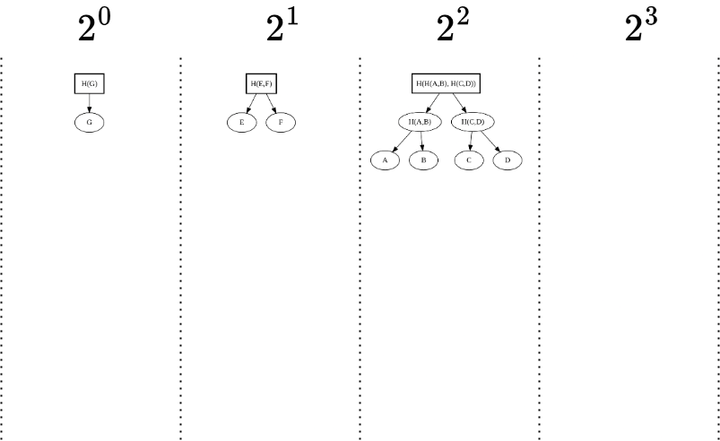 - These two peaks are merged to form a single root: H(H(H(A,B),H(C,D)),H(H(E,F),H(G,H)))