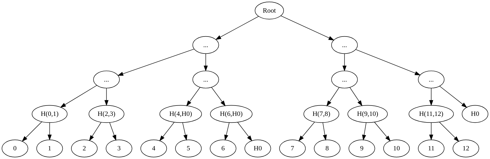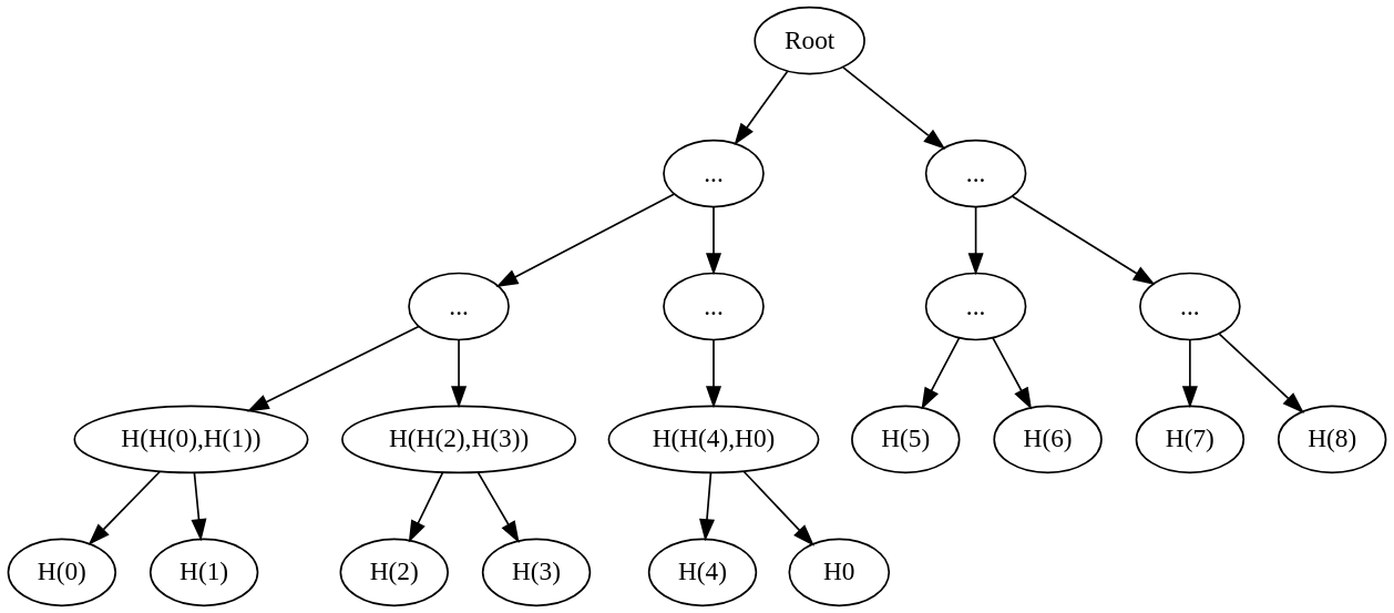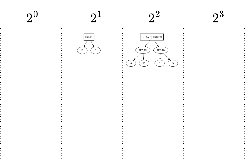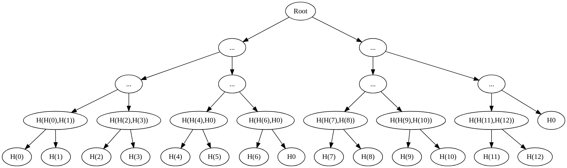 - These two peaks are merged to form a single root: H(H(H(A,B),H(C,D)),H(H(E,F),H(G,H)))
