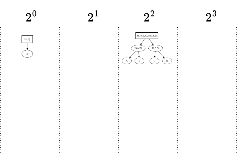 - Peak 1: A large Merkle tree rooted at H(H(A,B),H(C,D)), representing the first four elements (A,B,C,D).