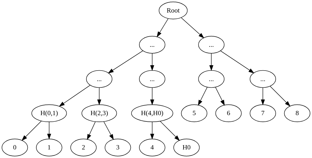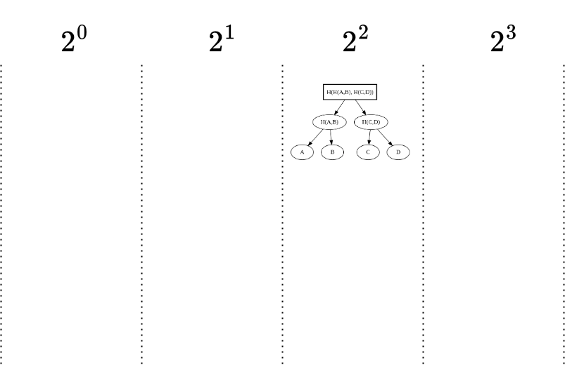 - Efficiency: Both appending to the MMR and generating proofs of inclusion are O(log(N))O(\log(N))O(log(N)) in time and space, where NNN is the size of the set.