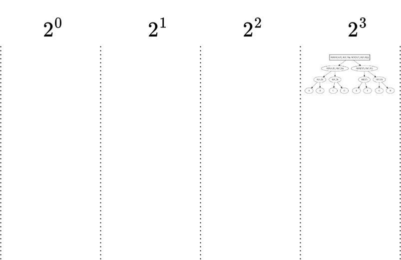 The node operator is a generalized binary Merkle tree where each branch node has at most one more element on the left side than the right side. By "element," we refer to input elements, which is not the same as a leaf which can be the "hash zero" sometimes. The hash computations are as follows: