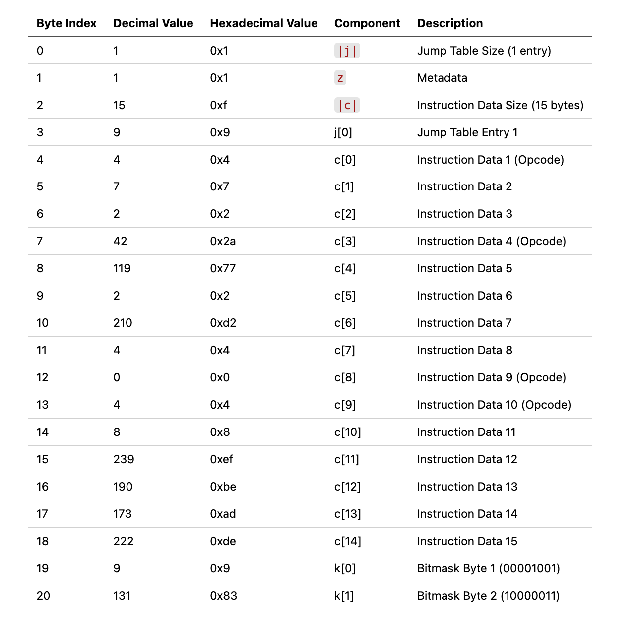 The jump table helps manage dynamic jumps, allowing for flexibility in the program's execution flow. The instruction data contains the program's instructions, while the opcode bitmask ensures that we know exactly where each instruction starts.