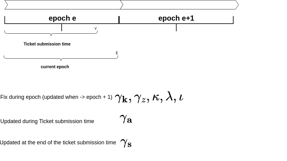 - γ_k (gamma_k): This is the set of validators hoping to participate in the next epoch. They submit tickets during the current epoch with the hope that their tickets will be included in γ_a (the set of best tickets for the next epoch). The goal is to remain in γ_a by the end of the ticket submission period, and for the next epoch to operate in normal mode.